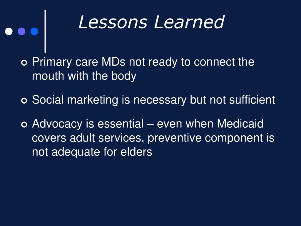 Lessons Learned • Primary care MDs not ready to connect the mouth with the body • Social marketing is necessary but not sufficient • Advocacy is essential – even when Medicaid covers adult services, preventive component is not adequate for elders
