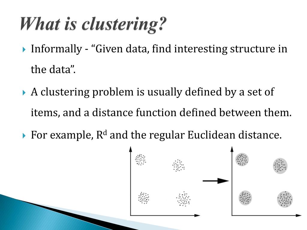 What is clustering? • Informally - “Given data, find interesting structure in the data”. • A clustering problem is usually defined by a set of items, and a distance function defined between them. • For example, Rd and the regular Euclidean distance.