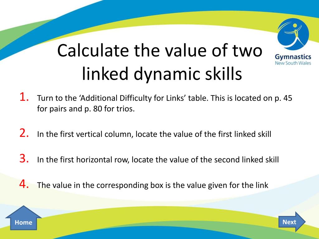 Calculate the value of twolinked dynamic skills • Turn to the ‘Additional Difficulty for Links’ table. This is located on p. 45 for pairs and p. 80 for trios. • In the first vertical column, locate the value of the first linked skill • In the first horizontal row, locate the value of the second linked skill • The value in the corresponding box is the value given for the link Home Next