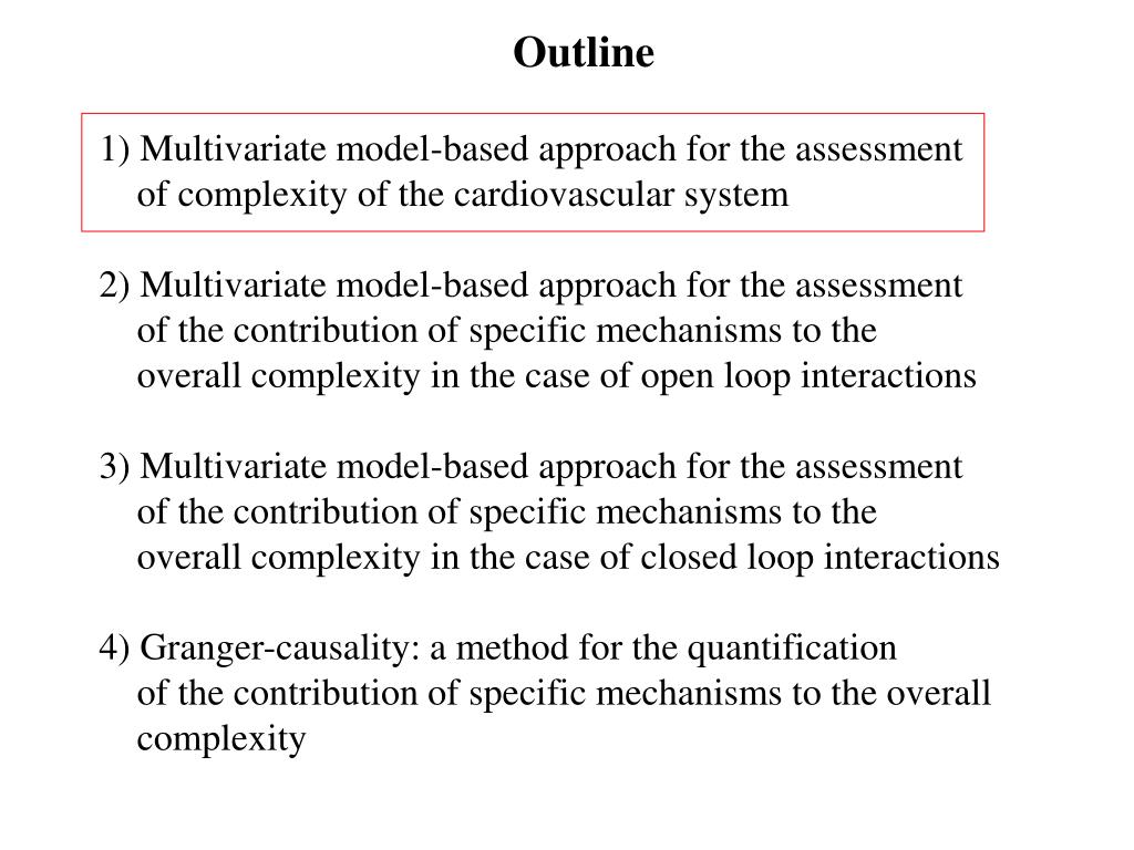 Outline 1) Multivariate model-based approach for the assessment of complexity of the cardiovascular system 2) Multivariate model-based approach for the assessment of the contribution of specific mechanisms to the overall complexity in the case of open loop interactions 3) Multivariate model-based approach for the assessment of the contribution of specific mechanisms to the overall complexity in the case of closed loop interactions 4) Granger-causality: a method for the quantification of the contribution of specific mechanisms to the overall complexity