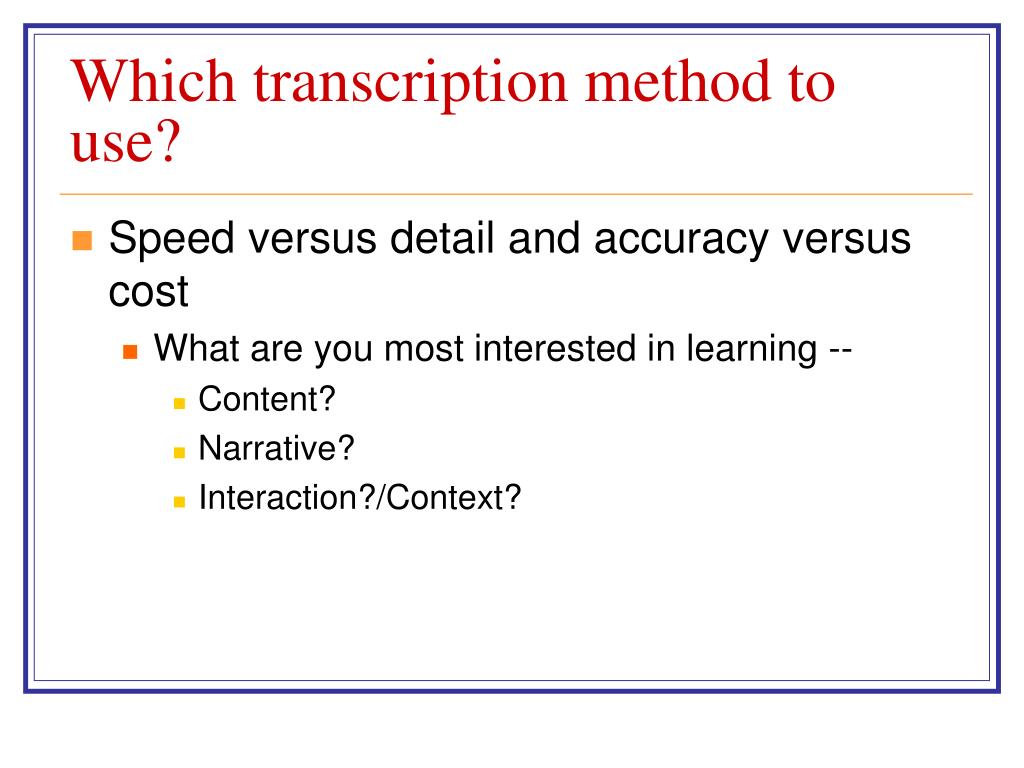 Which transcription method to use? • Speed versus detail and accuracy versus cost • What are you most interested in learning -- • Content? • Narrative? • Interaction?/Context?