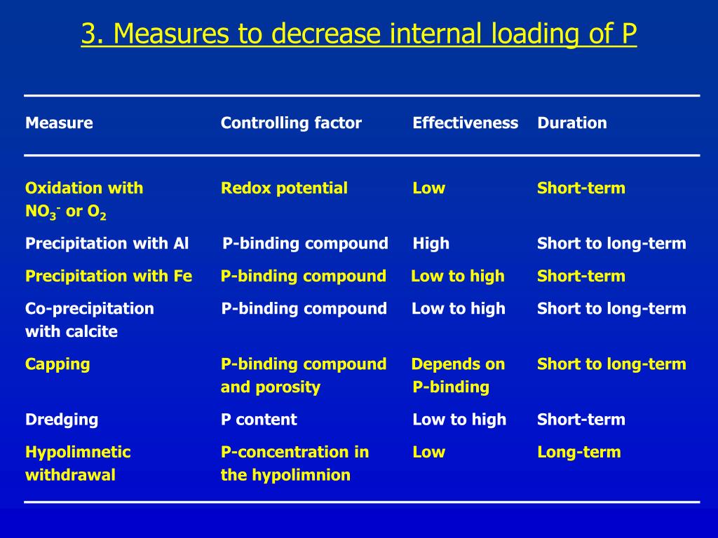 3. Measures to decrease internal loading of P Measure Controlling factor Effectiveness Duration Oxidation with Redox potential Low Short-termNO3- or O2 Precipitation with Al P-binding compound High Short to long-term Precipitation with Fe P-binding compound Low to high Short-term Co-precipitation P-binding compound Low to high Short to long-termwith calcite Capping P-binding compound Depends on Short to long-term and porosity P-binding Dredging P content Low to high Short-term Hypolimnetic P-concentration in Low Long-termwithdrawal the hypolimnion