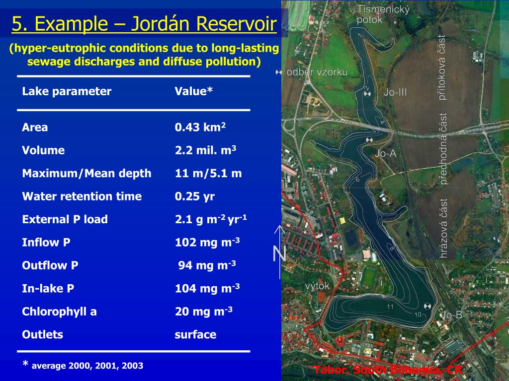 5. Example – Jordán Reservoir (hyper-eutrophic conditions due to long-lasting sewage discharges and diffuse pollution) Lake parameter Value* Area 0.43 km2 Volume 2.2 mil. m3 Maximum/Mean depth 11 m/5.1 m Water retention time 0.25 yr External P load 2.1 g m-2 yr-1 Inflow P 102 mg m-3 Outflow P 94 mg m-3 In-lake P 104 mg m-3 Chlorophyll a 20 mg m-3 Outlets surface * average 2000, 2001, 2003 Tábor, South Bohemia, CR