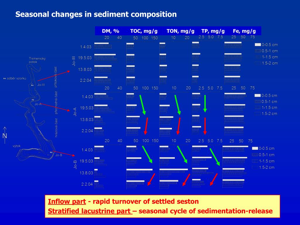 Inflow part - rapid turnover of settled sestonStratified lacustrine part – seasonal cycle of sedimentation-release Seasonal changes in sediment composition DM, % TOC, mg/g TON, mg/g TP, mg/g Fe, mg/g