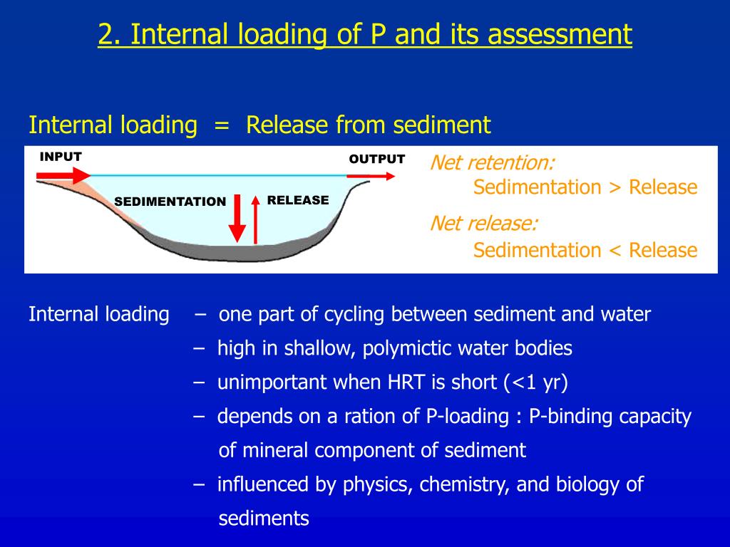 INPUT Net retention: Sedimentation > Release Net release: Sedimentation < Release OUTPUT RELEASE SEDIMENTATION 2. Internal loading of P and its assessment Internal loading = Release from sediment Internal loading – one part of cycling between sediment and water– high in shallow, polymictic water bodies– unimportant when HRT is short (<1 yr)– depends on a ration of P-loading : P-binding capacityof mineralcomponent of sediment– influenced by physics, chemistry, and biology of sediments