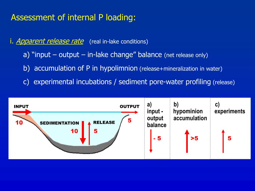 Assessment of internal P loading: i. Apparent release rate (real in-lake conditions)a) “input – output – in-lake change” balance (net release only)b) accumulation of P in hypolimnion (release+mineralization in water)c) experimental incubations / sediment pore-water profiling (release) a) b) c)input - hypominion experiments output accumulation balance INPUT OUTPUT 5 10 RELEASE SEDIMENTATION 10 5 - 5 >5 5