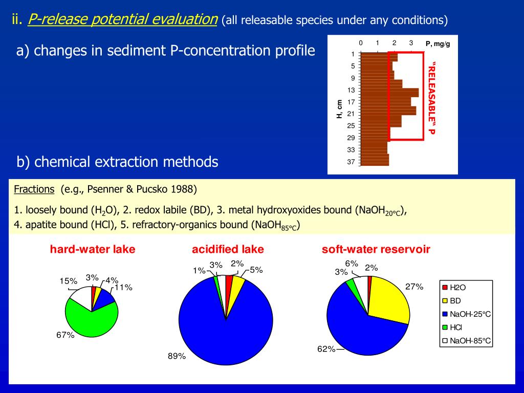 “RELEASABLE“ P b) chemical extraction methods Fractions(e.g., Psenner & Pucsko 1988) 1. loosely bound (H2O), 2. redox labile (BD), 3. metal hydroxyoxides bound (NaOH20°C), 4. apatite bound (HCl), 5. refractory-organics bound (NaOH85°C) ii. P-release potential evaluation(all releasable species under any conditions)a) changes in sediment P-concentration profile