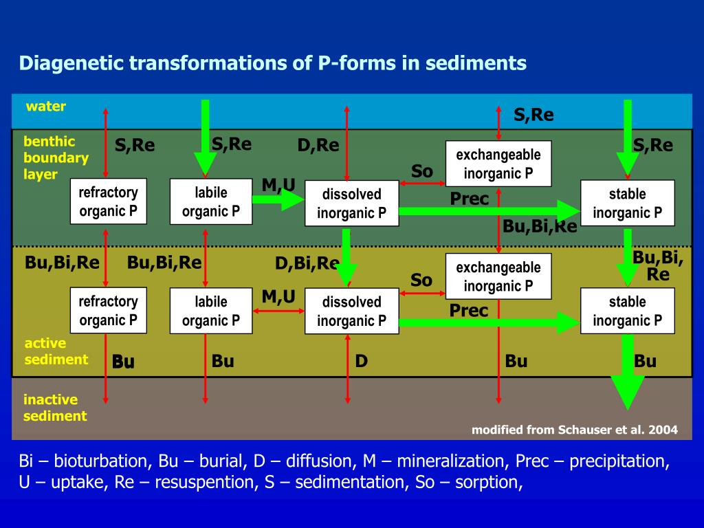 Diagenetic transformations of P-forms in sediments water S,Re benthicboundarylayer S,Re S,Re D,Re S,Re exchangeable inorganic P So M,U refractory organic P labile organic P stable inorganic P dissolved inorganic P Prec Bu,Bi,Re Bu,Bi,Re Bu,Bi,Re Bu,Bi,Re D,Bi,Re exchangeable inorganic P So M,U refractory organic P labile organic P stable inorganic P dissolved inorganic P Prec active sediment Bu Bu D Bu Bu Bu inactive sediment modified from Schauser et al. 2004 Bi – bioturbation, Bu – burial, D – diffusion, M – mineralization, Prec – precipitation, U – uptake, Re – resuspention, S – sedimentation, So – sorption,