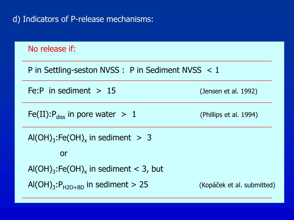 d)Indicators of P-release mechanisms:No release if: P in Settling-seston NVSS : P in Sediment NVSS < 1 Fe:P in sediment > 15 (Jensen et al. 1992) Fe(II):Pdiss in pore water > 1 (Phillips et al. 1994) Al(OH)3:Fe(OH)x in sediment > 3 or Al(OH)3:Fe(OH)x in sediment < 3, but Al(OH)3:PH2O+BD in sediment > 25 (Kopáček et al. submitted)