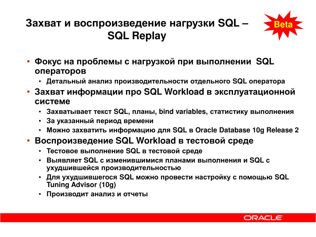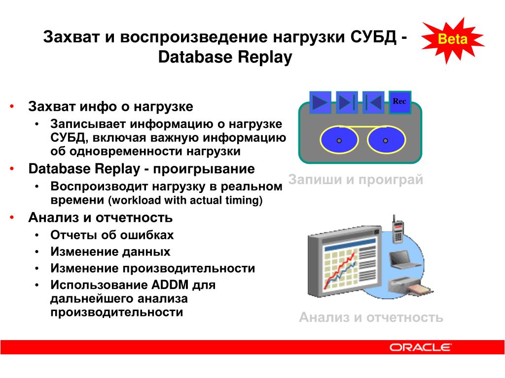 Захват и воспроизведение нагрузки СУБД - Database Replay Beta Rec • Захват инфо о нагрузке • Записывает информацию о нагрузке СУБД, включая важную информацию об одновременности нагрузки • Database Replay - проигрывание • Воспроизводит нагрузку в реальном времени (workload with actual timing) • Анализ и отчетность • Отчеты об ошибках • Изменение данных • Изменение производительности • Использование ADDM для дальнейшего анализа производительности Запиши и проиграй Анализ и отчетность