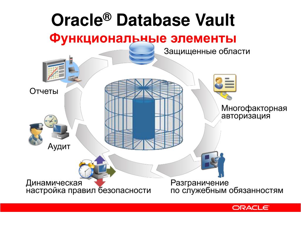 Oracle® Database VaultФункциональные элементы Защищенные области Отчеты Многофакторная авторизация Аудит Динамическаянастройка правил безопасности Разграничениепо служебным обязанностям