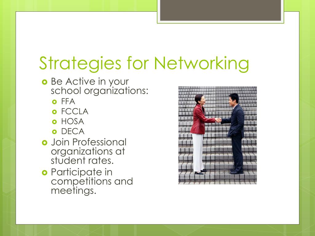 Strategies for Networking • Be Active in your school organizations: • FFA • FCCLA • HOSA • DECA • Join Professional organizations at student rates. • Participate in competitions and meetings.