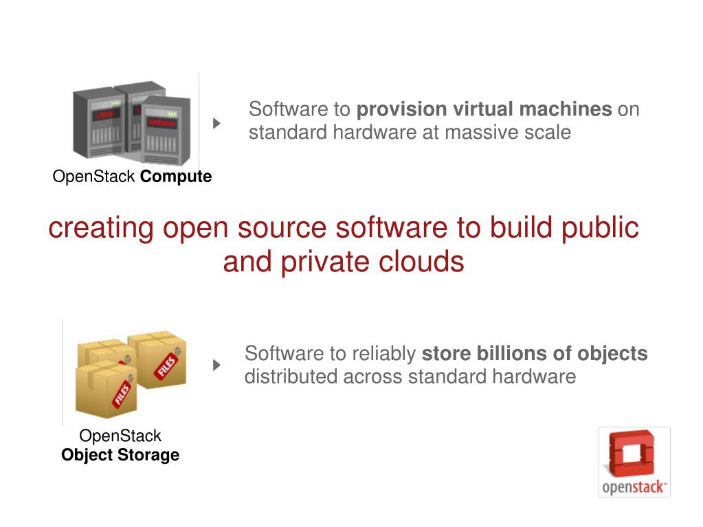 Software to provision virtual machines on standard hardware at massive scale OpenStack Compute creating open source software to build public and private clouds Software to reliably store billions of objects distributed across standard hardware OpenStack Object Storage