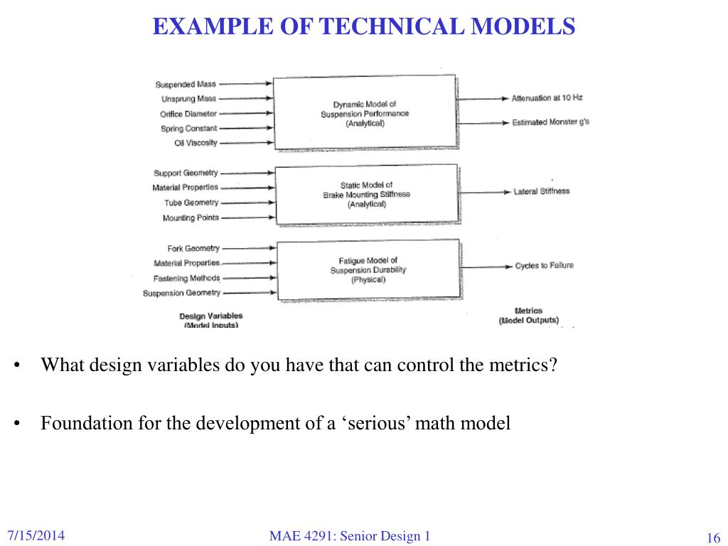 EXAMPLE OF TECHNICAL MODELS • What design variables do you have that can control the metrics? • Foundation for the development of a ‘serious’ math model MAE 4291: Senior Design 1