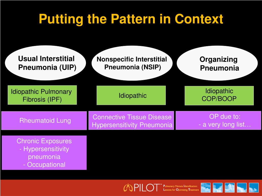 Usual Interstitial Pneumonia (UIP) Organizing Pneumonia Nonspecific Interstitial Pneumonia (NSIP) Putting the Pattern in Context Idiopathic COP/BOOP Idiopathic Pulmonary Fibrosis (IPF) Idiopathic • OP due to: • a very long list… Connective Tissue Disease Hypersensitivity Pneumonia Rheumatoid Lung • Chronic Exposures • Hypersensitivity pneumonia • Occupational