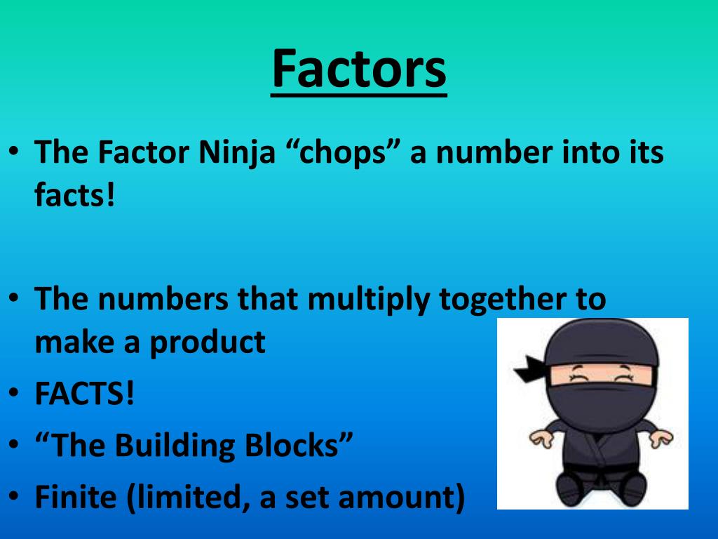 Factors • The Factor Ninja “chops” a number into its facts! • The numbers that multiply together to make a product • FACTS! • “The Building Blocks” • Finite (limited, a set amount)