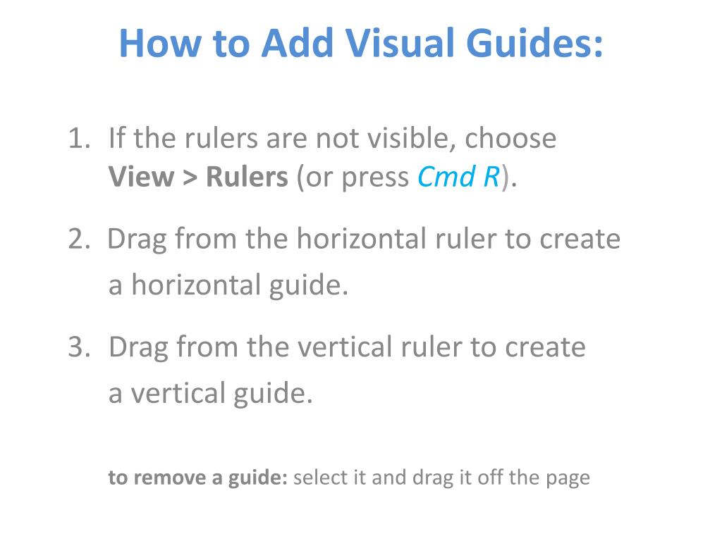 How to Add Visual Guides: If the rulers are not visible, chooseView > Rulers (or press Cmd R). 2. Drag from the horizontal ruler to create a horizontal guide. 3. Drag from the vertical ruler to create a vertical guide. to remove a guide: select it and drag it off the page