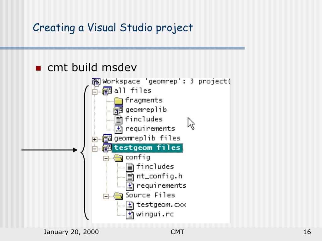 Package name;“used” packages Anatomy of a requirements file package geomrep use geometry v0 use graphics v0 macro geomrep_linkopts "-L ${GEOMREPROOT}/${CMTCONFIG} -lgeomrep"\ VisualC "geomrep.lib" private library geomrep *.cxx ../geomrep/*.h application testgeom -windows ../test/testgeom.cxx\ ${GRAPHICSROOT}/windows/wingui.rc Define a make macro:will be used by client links Two “constituents”:a library and an executable CMT