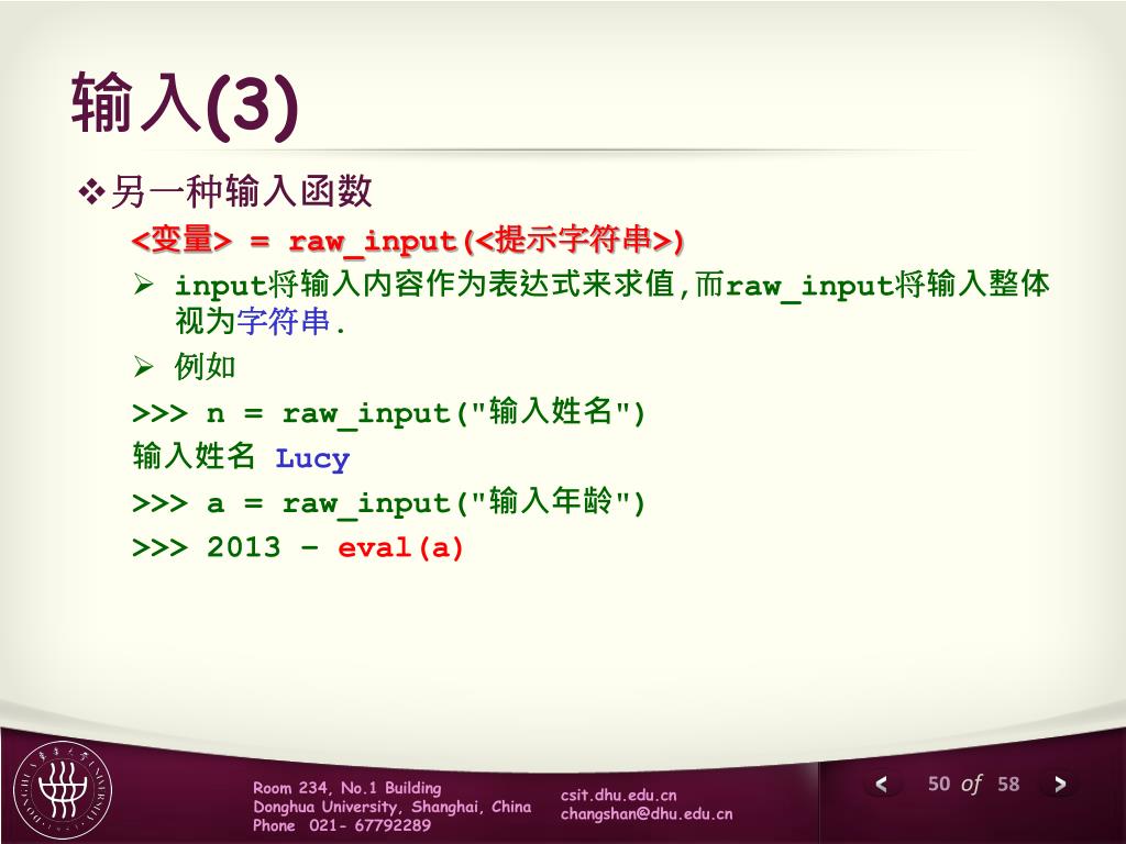 输入(3) • 另一种输入函数 <变量> = raw_input(<提示字符串>) • input将输入内容作为表达式来求值,而raw_input将输入整体视为字符串. • 例如 >>> n = raw_input("输入姓名") 输入姓名 Lucy >>> a = raw_input("输入年龄") >>> 2013 – eval(a)