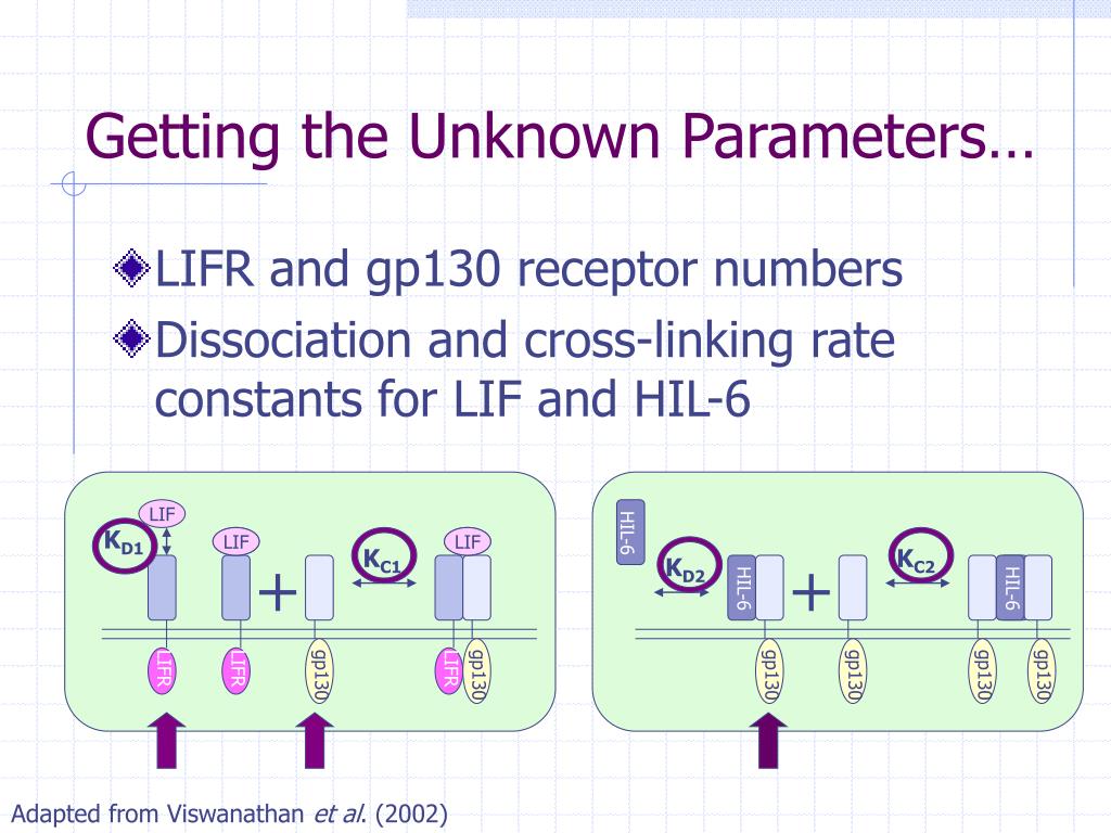LIF KD1 LIF LIF KC1 LIFR LIFR LIFR gp130 gp130 HIL-6 KC2 KD2 HIL-6 HIL-6 gp130 gp130 gp130 gp130 Getting the Unknown Parameters… • LIFR and gp130 receptor numbers • Dissociation and cross-linking rate constants for LIF and HIL-6 Adapted from Viswanathan et al. (2002)
