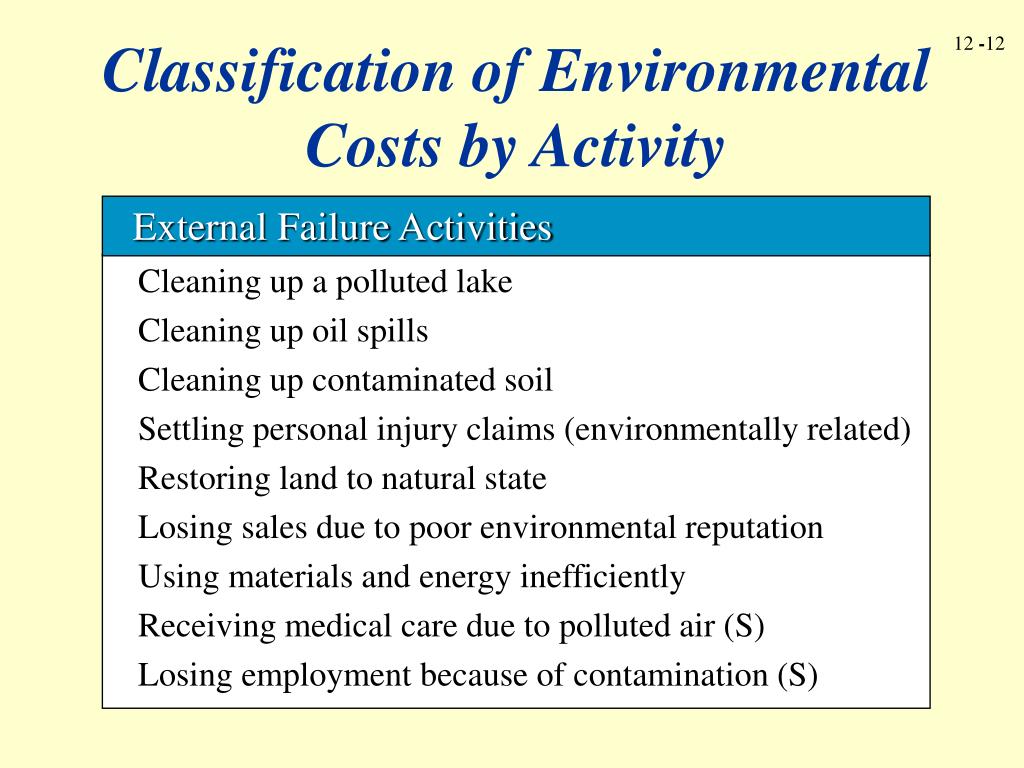 Classification of Environmental Costs by Activity External Failure Activities Cleaning up a polluted lake Cleaning up oil spills Cleaning up contaminated soil Settling personal injury claims (environmentally related) Restoring land to natural state Losing sales due to poor environmental reputation Using materials and energy inefficiently Receiving medical care due to polluted air (S) Losing employment because of contamination (S)