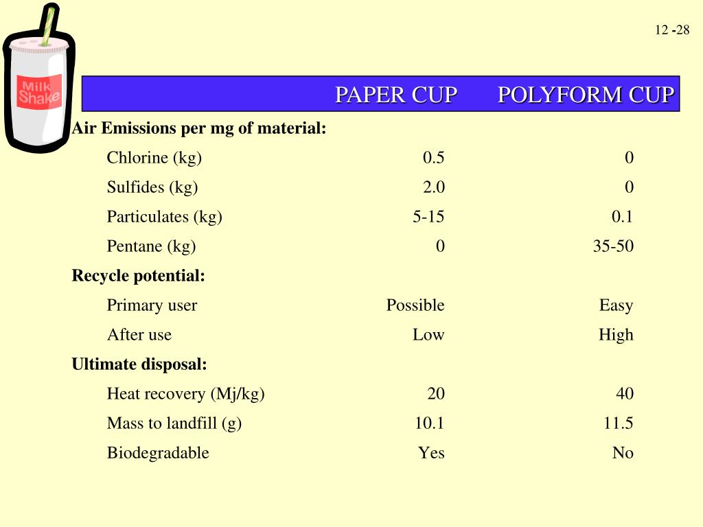 PAPER CUP POLYFORM CUP • Air Emissions per mg of material: • Chlorine (kg) 0.5 0 • Sulfides (kg) 2.0 0 • Particulates (kg) 5-15 0.1 • Pentane (kg) 0 35-50 • Recycle potential: • Primary user Possible Easy • After use Low High • Ultimate disposal: • Heat recovery (Mj/kg) 20 40 • Mass to landfill (g) 10.1 11.5 • Biodegradable Yes No