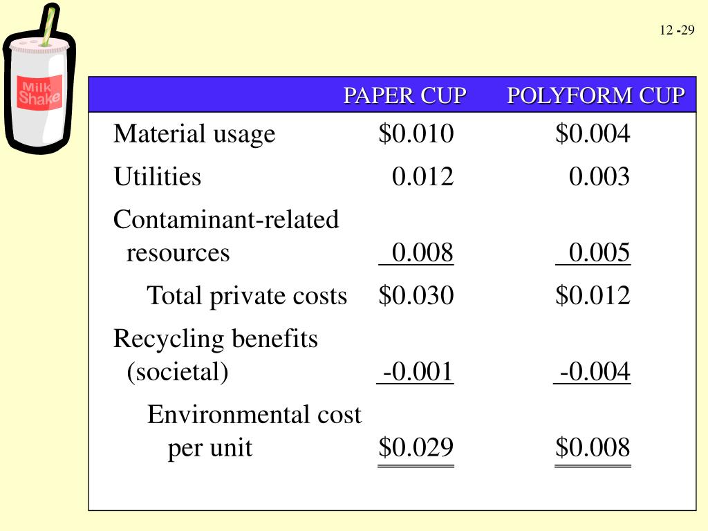 PAPER CUP POLYFORM CUP Material usage $0.010 $0.004 Utilities 0.012 0.003 Contaminant-related resources 0.008 0.005 Total private costs $0.030 $0.012 Recycling benefits (societal) -0.001 -0.004 Environmental cost per unit $0.029 $0.008