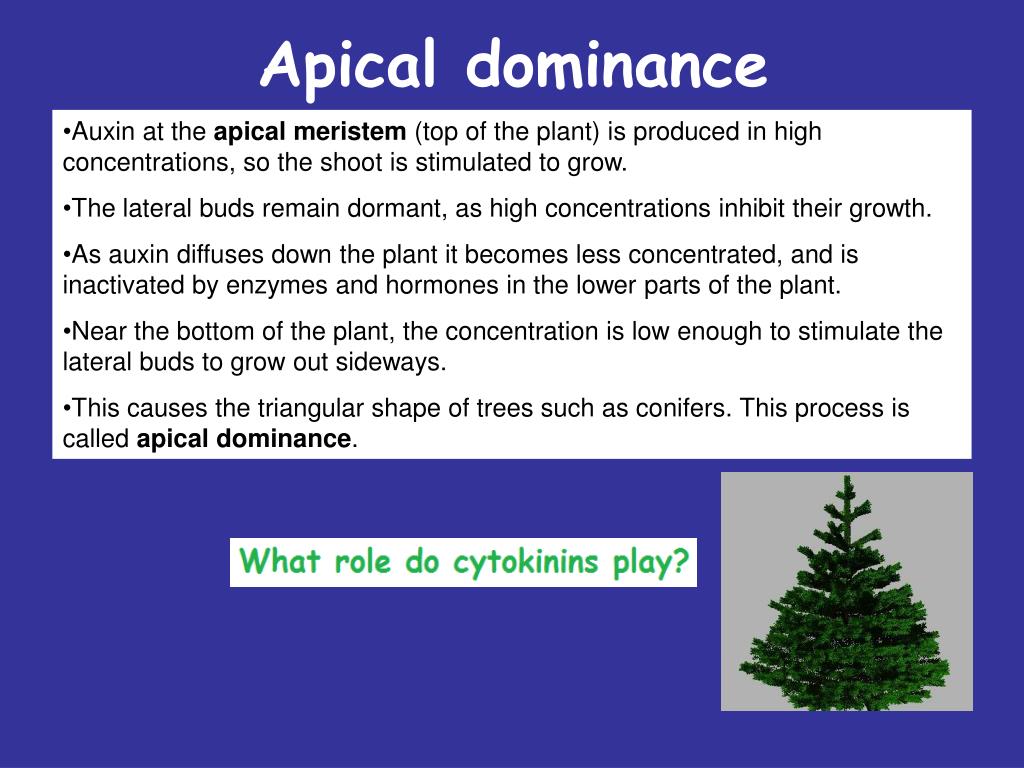 Apical dominance • Auxin at the apical meristem (top of the plant) is produced in high concentrations, so the shoot is stimulated to grow. • The lateral buds remain dormant, as high concentrations inhibit their growth. • As auxin diffuses down the plant it becomes less concentrated, and is inactivated by enzymes and hormones in the lower parts of the plant. • Near the bottom of the plant, the concentration is low enough to stimulate the lateral buds to grow out sideways. • This causes the triangular shape of trees such as conifers. This process is called apical dominance.
