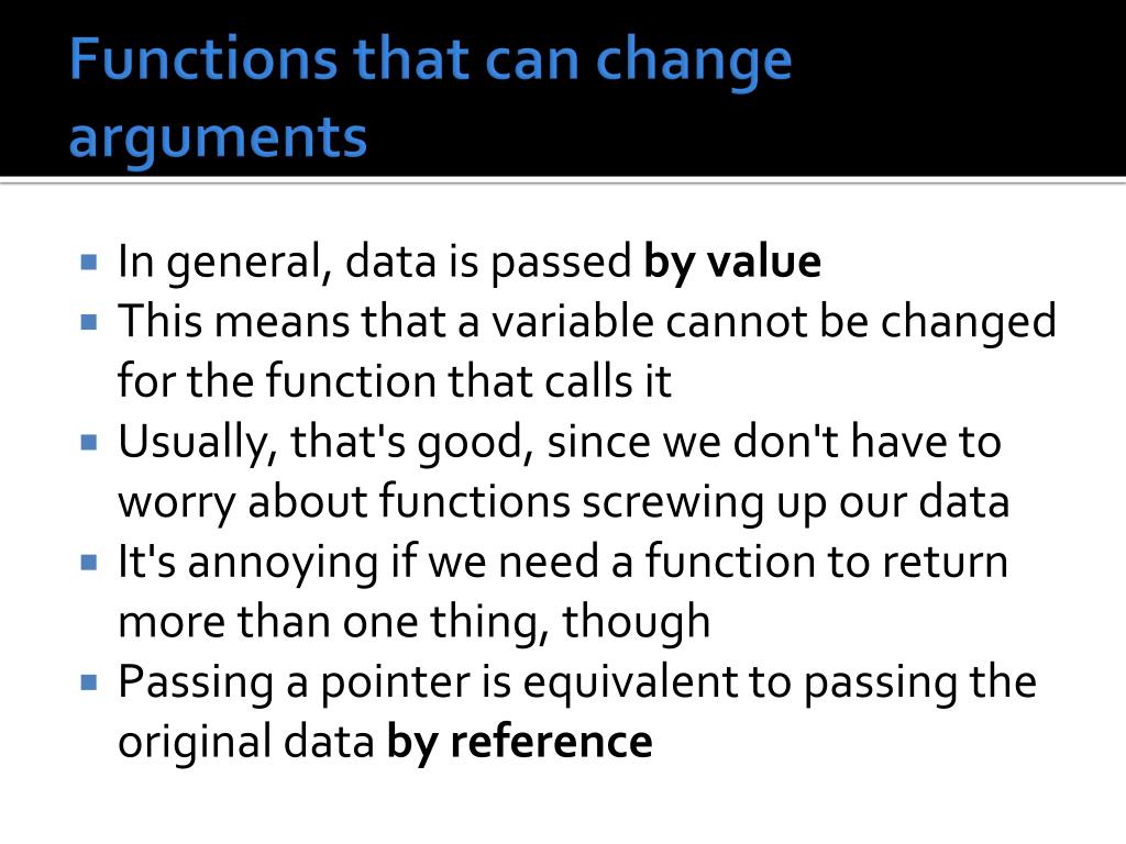 Functions that can change arguments • In general, data is passed by value • This means that a variable cannot be changed for the function that calls it • Usually, that's good, since we don't have to worry about functions screwing up our data • It's annoying if we need a function to return more than one thing, though • Passing a pointer is equivalent to passing the original data by reference