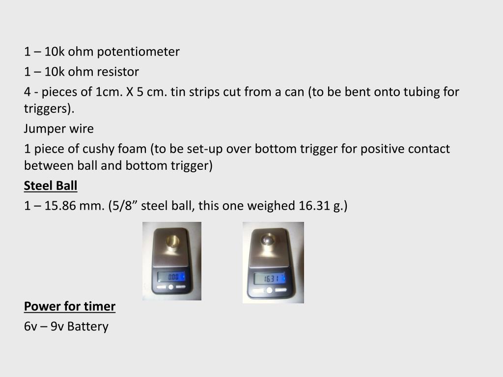 1 – 10k ohm potentiometer 1 – 10k ohm resistor 4 - pieces of 1cm. X 5 cm. tin strips cut from a can (to be bent onto tubing for triggers). Jumper wire 1 piece of cushy foam (to be set-up over bottom trigger for positive contact between ball and bottom trigger) Steel Ball 1 – 15.86 mm. (5/8” steel ball, this one weighed 16.31 g.) Power for timer 6v – 9v Battery