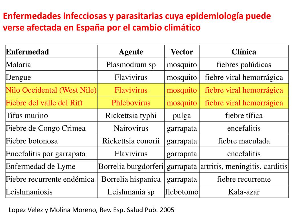 Enfermedades infecciosas y parasitarias cuya epidemiología puede verse afectada en España por el cambio climático Lopez Velez y Molina Moreno, Rev. Esp. Salud Pub. 2005