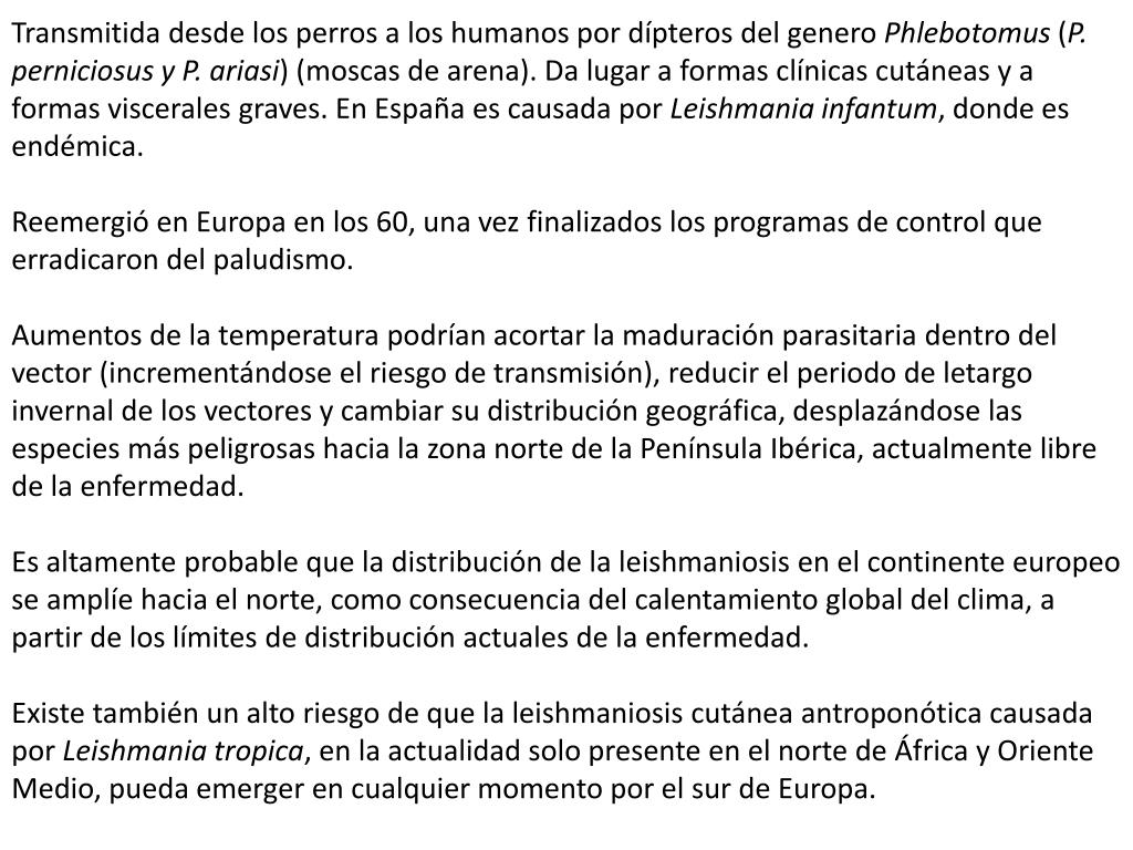 Transmitida desde los perros a los humanos por dípteros del genero Phlebotomus (P. perniciosus y P. ariasi) (moscas de arena). Da lugar a formas clínicas cutáneas y a formas viscerales graves. En España es causada por Leishmaniainfantum, donde es endémica. Reemergió en Europa en los 60, una vez finalizados los programas de control que erradicaron del paludismo. Aumentos de la temperatura podrían acortar la maduración parasitaria dentro del vector (incrementándose el riesgo de transmisión), reducir el periodo de letargo invernal de los vectores y cambiar su distribución geográfica, desplazándose las especies más peligrosas hacia la zona norte de la Península Ibérica, actualmente libre de la enfermedad. Es altamente probable que la distribución de la leishmaniosis en el continente europeo se amplíe hacia el norte, como consecuencia del calentamiento global del clima, a partir de los límites de distribución actuales de la enfermedad. Existe también un alto riesgo de que la leishmaniosis cutánea antroponótica causada por Leishmaniatropica, en la actualidad solo presente en el norte de África y Oriente Medio, pueda emerger en cualquier momento por el sur de Europa.