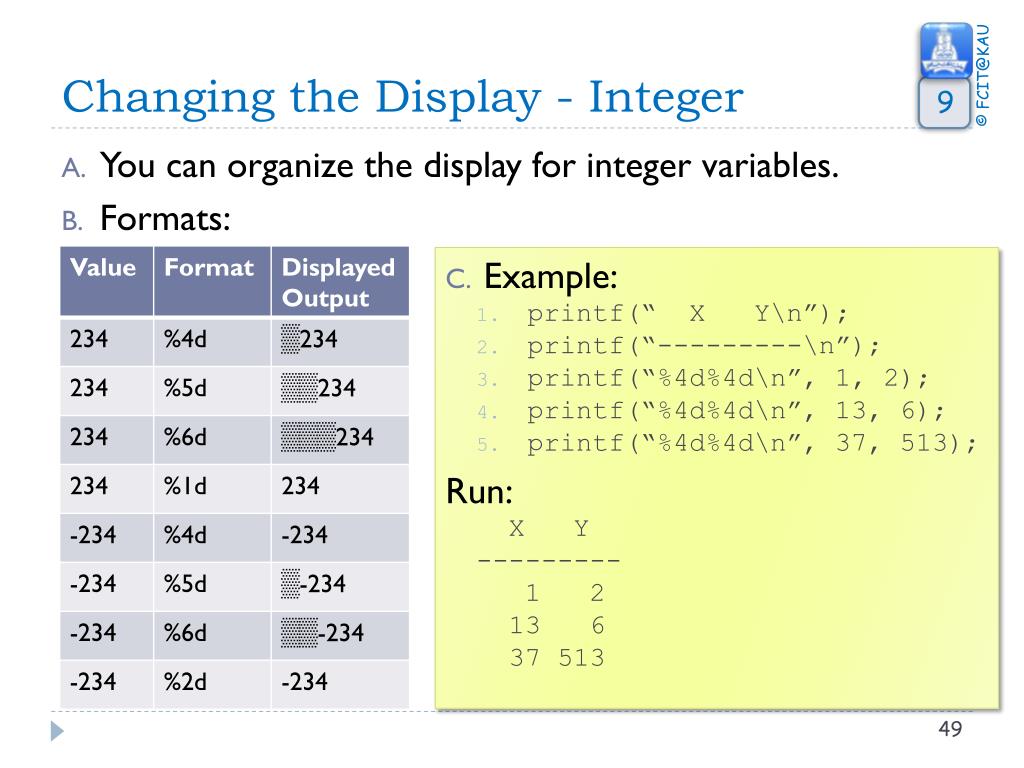 Changing the Display - Integer 9 • You can organize the display for integer variables. • Formats: • Example: • printf(“ X Y\n”); • printf(“---------\n”); • printf(“%4d%4d\n”, 1, 2); • printf(“%4d%4d\n”, 13, 6); • printf(“%4d%4d\n”, 37, 513); • Run: X Y --------- 1 2 13 6 37 513