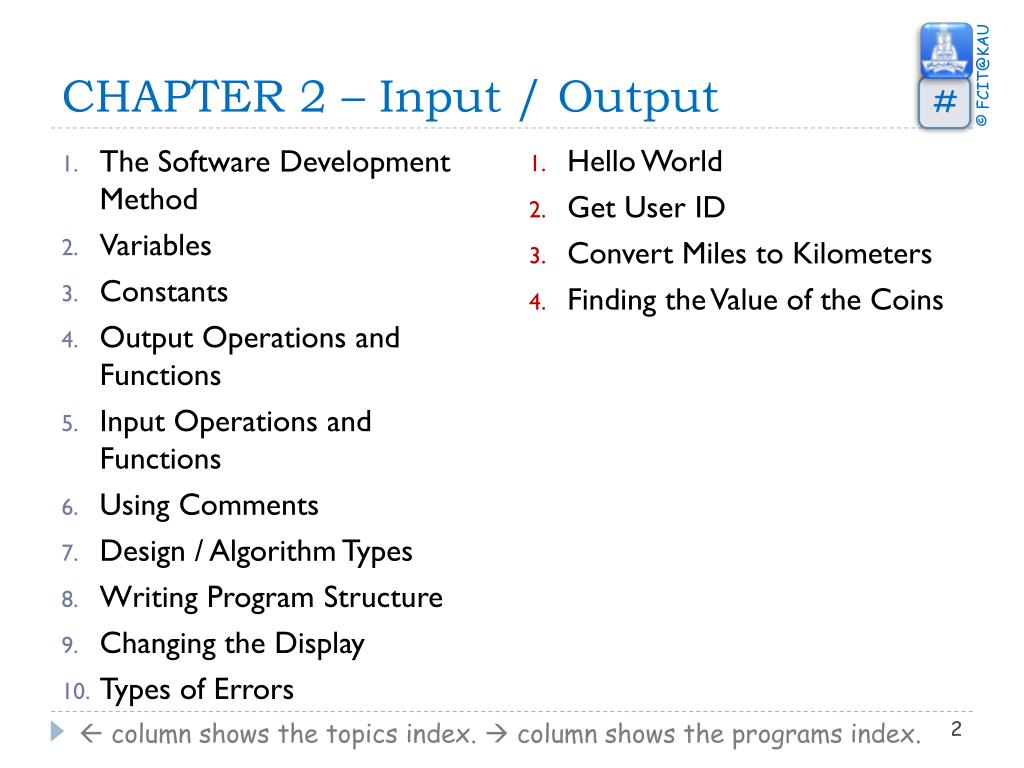 CHAPTER 2 – Input / Output # • Hello World • Get User ID • Convert Miles to Kilometers • Finding the Value of the Coins • The Software Development Method • Variables • Constants • Output Operations and Functions • Input Operations and Functions • Using Comments • Design / Algorithm Types • Writing Program Structure • Changing the Display • Types of Errors • column shows the topics index. column shows the programs index.