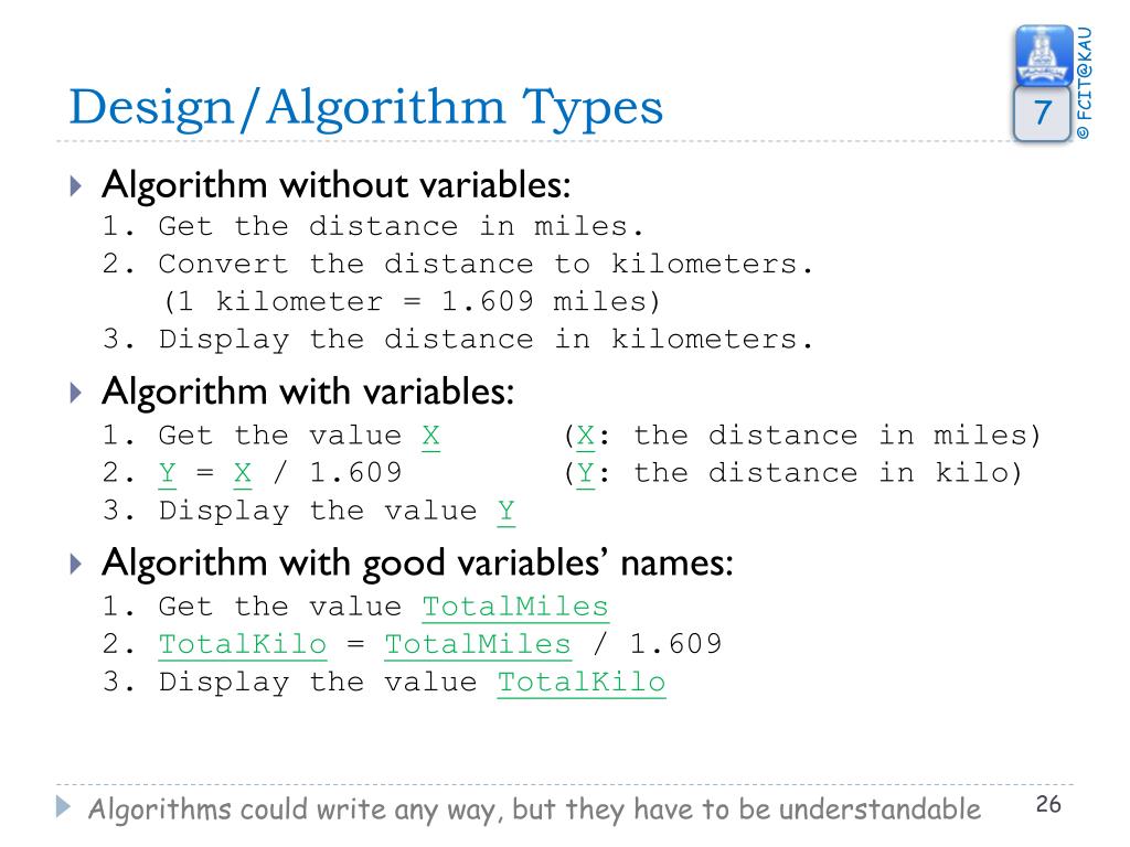 Design/Algorithm Types 7 • Algorithm without variables:1. Get the distance in miles.2. Convert the distance to kilometers. (1 kilometer = 1.609 miles)3. Display the distance in kilometers. • Algorithm with variables:1. Get the value X (X: the distance in miles)2. Y = X / 1.609 (Y: the distance in kilo)3. Display the value Y • Algorithm with good variables’ names:1. Get the value TotalMiles2. TotalKilo = TotalMiles / 1.6093. Display the value TotalKilo • Algorithms could write any way, but they have to be understandable