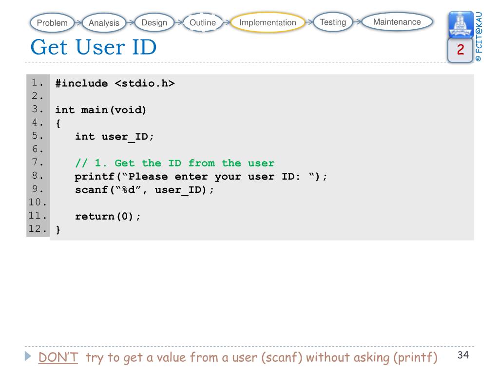 Get User ID Implementation Testing Maintenance Problem Analysis Design Outline 2 1. 2. 3. 4. 5. 6. 7. 8. 9. 10. 11. 12. #include <stdio.h> int main(void) { intuser_ID; // 1. Get the ID from the user printf(“Please enter your user ID: “); scanf(“%d”, user_ID); return(0); } • DON’T try to get a value from a user (scanf) without asking (printf)