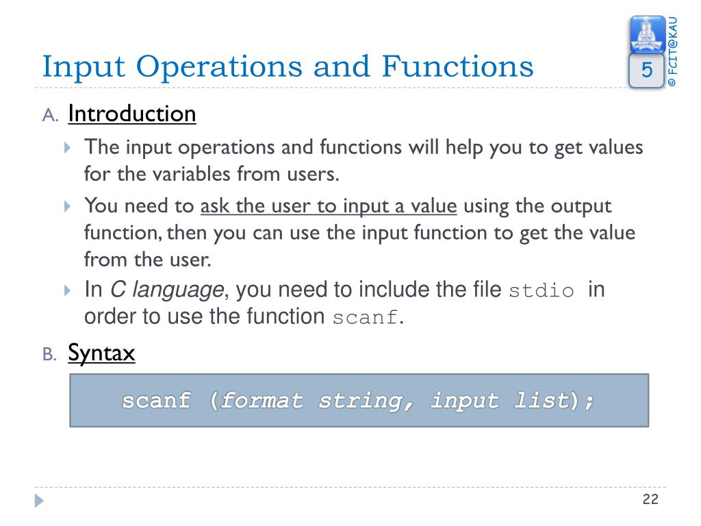 Input Operations and Functions 5 • Introduction • The input operations and functions will help you to get values for the variables from users. • You need to ask the user to input a value using the output function, then you can use the input function to get the value from the user. • In C language, you need to include the file stdioin order to use the function scanf. • Syntax scanf(format string, input list);