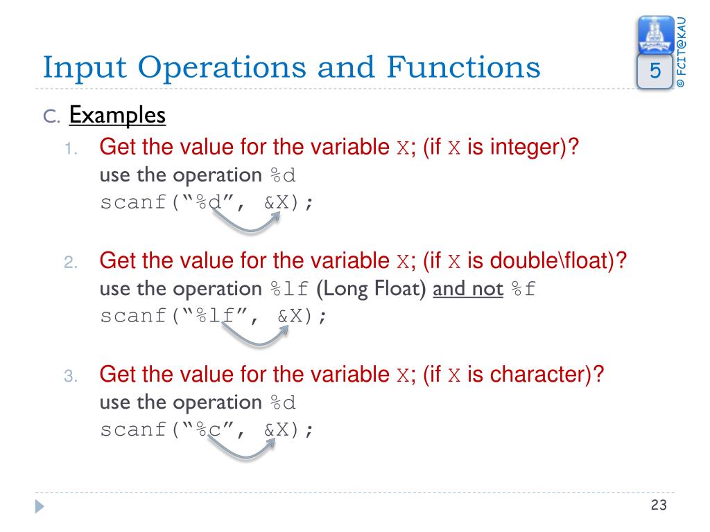 Input Operations and Functions 5 • Examples • Get the value for the variable X; (if X is integer)?use the operation %dscanf(“%d”, &X); • Get the value for the variable X; (if X is double\float)? use the operation %lf (Long Float) and not%fscanf(“%lf”, &X); • Get the value for the variable X; (if X is character)?use the operation %dscanf(“%c”, &X);