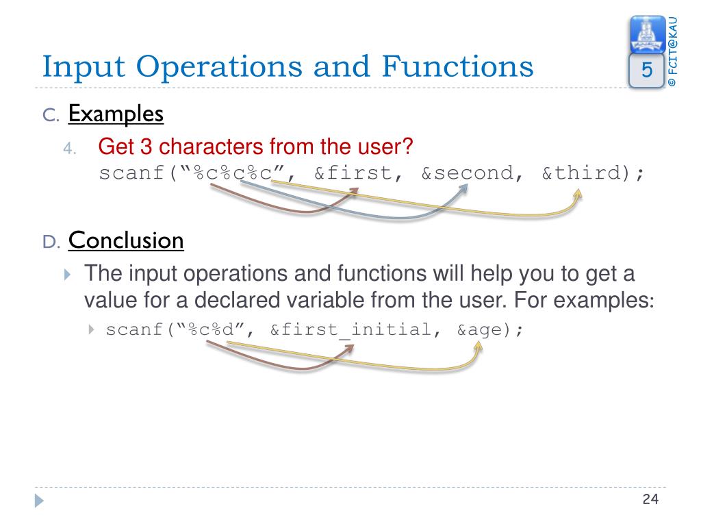 Output Operations and Functions 4 • Conclusion • The output operations and functions will help you to display text and/or the values of a group of variables on the screen. For examples: • printf(“Enter the object mass in grams?”); • printf(“%c”, first_init); • printf(“I am %d years old.”, AGE);