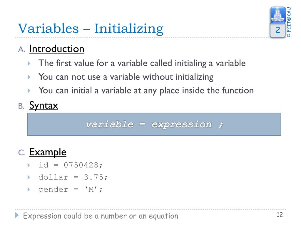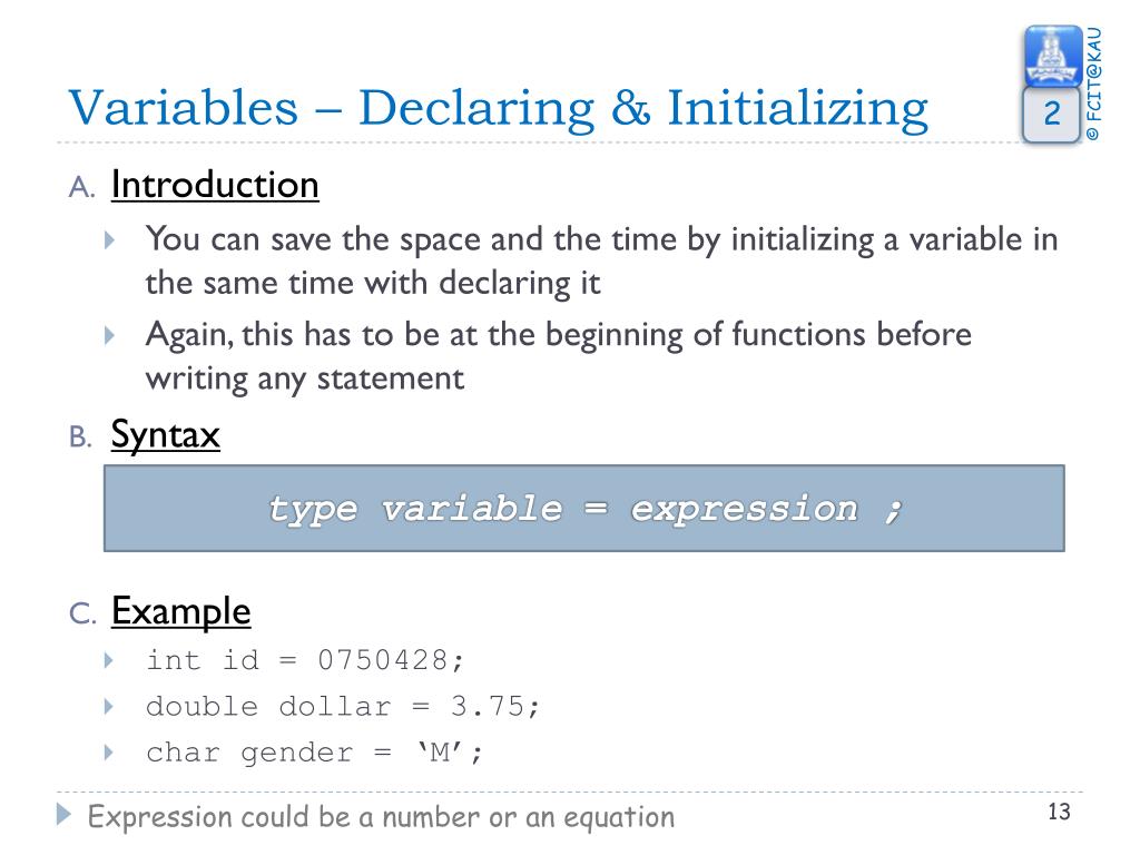 Variables – Declaring & Initializing 2 • Introduction • You can save the space and the time by initializing a variable in the same time with declaring it • Again, this has to be at the beginning of functions before writing any statement • Syntax • Example • int id = 0750428; • double dollar = 3.75; • char gender = ‘M’; typevariable = expression ; • Expression could be a number or an equation