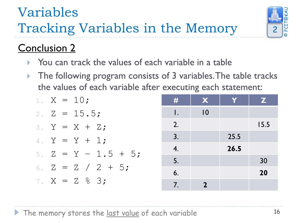 VariablesTracking Variables in the Memory 2 Conclusion 2 • You can track the values of each variable in a table • The following program consists of 3 variables. The table tracks the values of each variable after executing each statement: • X = 10; • Z = 15.5; • Y = X + Z; • Y = Y + 1; • Z = Y – 1.5 + 5; • Z = Z / 2 + 5; • X = Z % 3; • The memory stores the last value of each variable