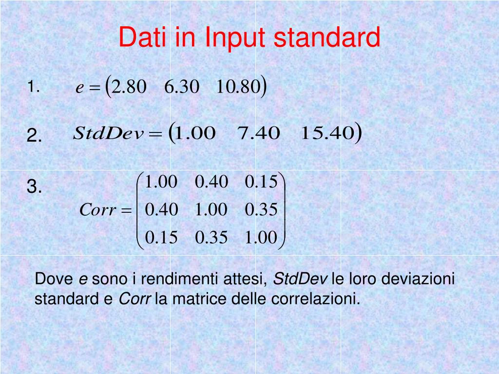 Dati in Input standard 1. 2. 3. Dove e sono i rendimenti attesi, StdDev le loro deviazioni standard e Corr la matrice delle correlazioni.