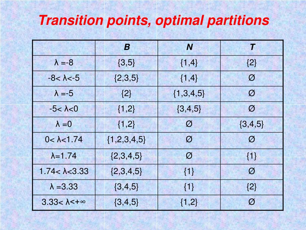 Pregi del metodo • Come in Markowitz, i punti della optimalvalue function corrispondono ad intervalli del parametro su cui la partizione è costante • Il metodo è una estensione del modello di Markowitz anche in caso di degenerazione, grazie alla nozione di tri-partition sets