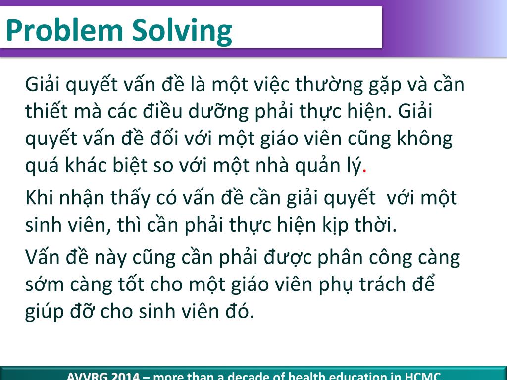 Problem Solving Giảiquyếtvấnđềlàmộtviệcthườnggặpvàcầnthiếtmàcácđiềudưỡngphảithựchiện. Giảiquyếtvấnđềđốivớimộtgiáoviêncũngkhôngquákhácbiệt so vớimộtnhàquảnlý. Khinhậnthấycóvấnđềcầngiảiquyếtvớimột sinh viên, thìcầnphảithựchiệnkịpthời. Vấn đề nàycũngcần phải được phâncôngcàng sớm càng tốt cho một giáoviênphụtráchđể giúpđỡchosinhviênđó.