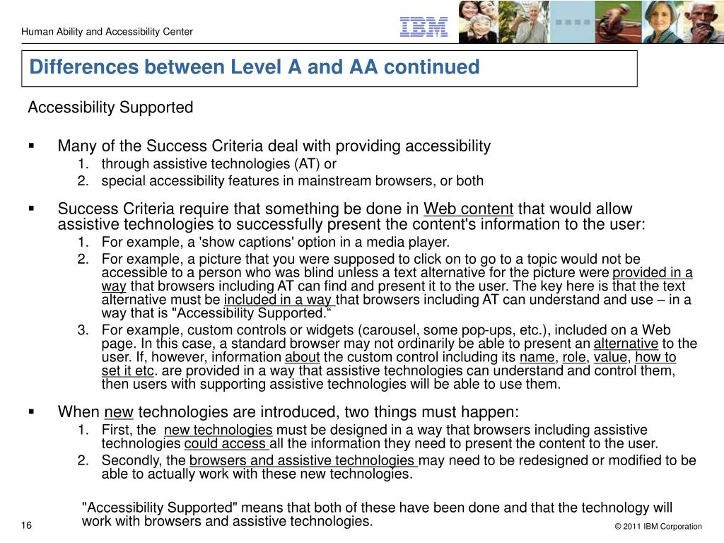 Differences between Level A and AA continued • Accessibility Supported • Many of the Success Criteria deal with providing accessibility • through assistive technologies (AT) or • special accessibility features in mainstream browsers, or both • Success Criteria require that something be done in Web content that would allow assistive technologies to successfully present the content's information to the user: • For example, a 'show captions' option in a media player. • For example, a picture that you were supposed to click on to go to a topic would not be accessible to a person who was blind unless a text alternative for the picture were provided in a way that browsers including AT can find and present it to the user. The key here is that the text alternative must be included in a way that browsers including AT can understand and use – in a way that is "Accessibility Supported.“ • For example, custom controls or widgets (carousel, some pop-ups, etc.), included on a Web page. In this case, a standard browser may not ordinarily be able to present an alternative to the user. If, however, information about the custom control including its name, role, value, how to set it etc. are provided in a way that assistive technologies can understand and control them, then users with supporting assistive technologies will be able to use them. • When new technologies are introduced, two things must happen: • First, the new technologies must be designed in a way that browsers including assistive technologies could access all the information they need to present the content to the user. • Secondly, the browsers and assistive technologies may need to be redesigned or modified to be able to actually work with these new technologies. "Accessibility Supported" means that both of these have been done and that the technology will work with browsers and assistive technologies.