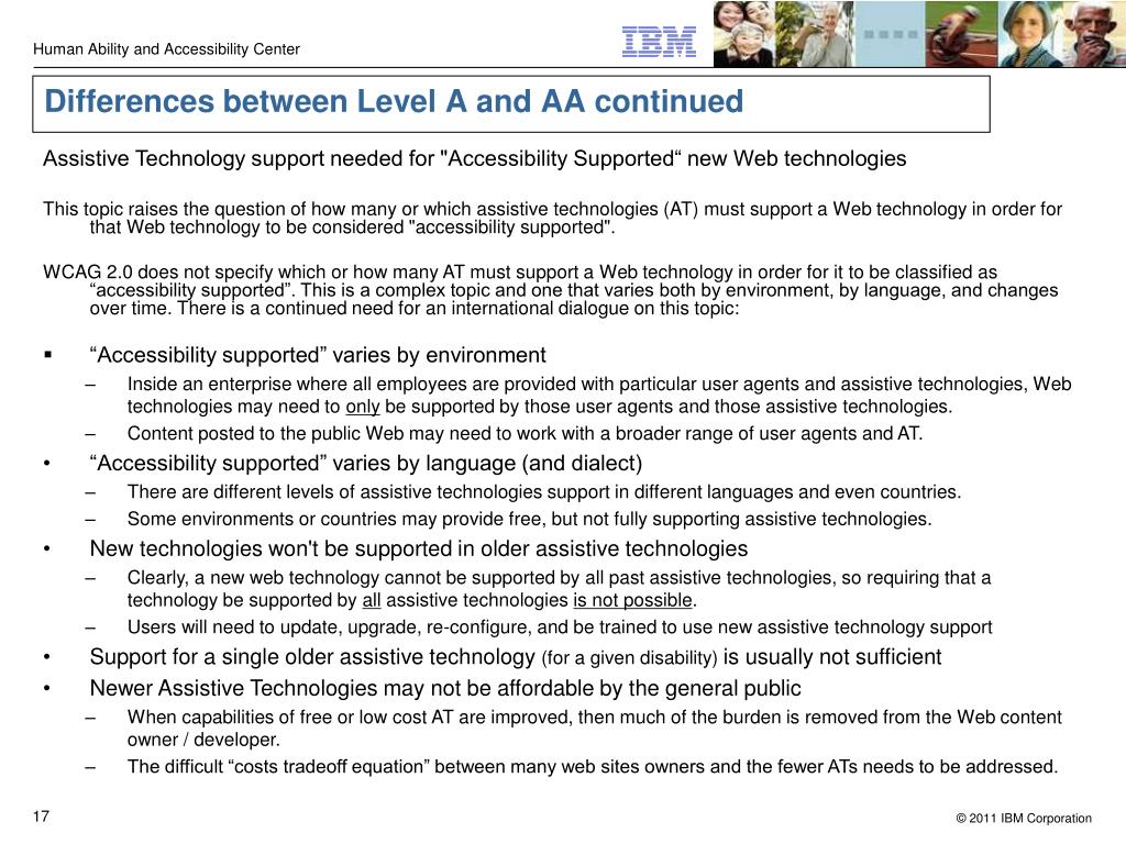 Differences between Level A and AA continued • Assistive Technology support needed for "Accessibility Supported“ new Web technologies This topic raises the question of how many or which assistive technologies (AT) must support a Web technology in order for that Web technology to be considered "accessibility supported". WCAG 2.0 does not specify which or how many AT must support a Web technology in order for it to be classified as “accessibility supported”. This is a complex topic and one that varies both by environment, by language, and changes over time. There is a continued need for an international dialogue on this topic: • “Accessibility supported” varies by environment • Inside an enterprise where all employees are provided with particular user agents and assistive technologies, Web technologies may need to only be supported by those user agents and those assistive technologies. • Content posted to the public Web may need to work with a broader range of user agents and AT. • “Accessibility supported” varies by language (and dialect) • There are different levels of assistive technologies support in different languages and even countries. • Some environments or countries may provide free, but not fully supporting assistive technologies. • New technologies won't be supported in older assistive technologies • Clearly, a new web technology cannot be supported by all past assistive technologies, so requiring that a technology be supported by all assistive technologies is not possible. • Users will need to update, upgrade, re-configure, and be trained to use new assistive technology support • Support for a single older assistive technology (for a given disability) is usually not sufficient • Newer Assistive Technologies may not be affordable by the general public • When capabilities of free or low cost AT are improved, then much of the burden is removed from the Web content owner / developer. • The difficult “costs tradeoff equation” between many web sites owners and the fewer ATs needs to be addressed.