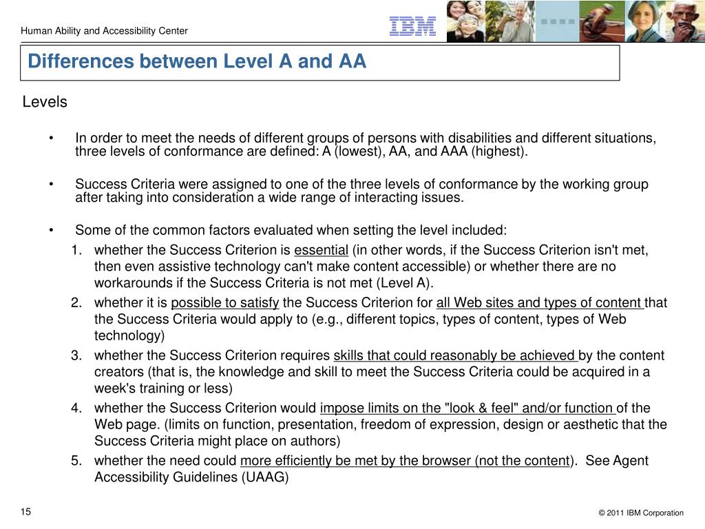 Differences between Level A and AA • Levels • In order to meet the needs of different groups of persons with disabilities and different situations, three levels of conformance are defined: A (lowest), AA, and AAA (highest). • Success Criteria were assigned to one of the three levels of conformance by the working group after taking into consideration a wide range of interacting issues. • Some of the common factors evaluated when setting the level included: • whether the Success Criterion is essential (in other words, if the Success Criterion isn't met, then even assistive technology can't make content accessible) or whether there are no workarounds if the Success Criteria is not met (Level A). • whether it is possible to satisfy the Success Criterion for all Web sites and types of content that the Success Criteria would apply to (e.g., different topics, types of content, types of Web technology) • whether the Success Criterion requires skills that could reasonably be achieved by the content creators (that is, the knowledge and skill to meet the Success Criteria could be acquired in a week's training or less) • whether the Success Criterion would impose limits on the "look & feel" and/or function of the Web page. (limits on function, presentation, freedom of expression, design or aesthetic that the Success Criteria might place on authors) • whether the need could more efficiently be met by the browser (not the content). See Agent Accessibility Guidelines (UAAG)