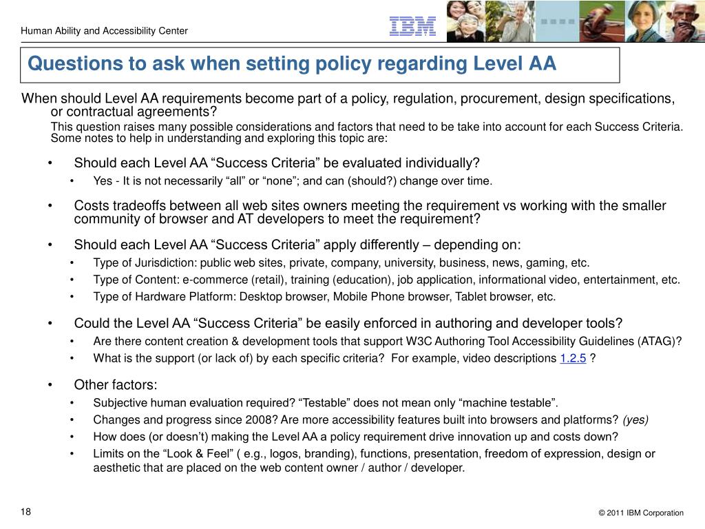 Questions to ask when setting policy regarding Level AA • When should Level AA requirements become part of a policy, regulation, procurement, design specifications, or contractual agreements? This question raises many possible considerations and factors that need to be take into account for each Success Criteria. Some notes to help in understanding and exploring this topic are: • Should each Level AA “Success Criteria” be evaluated individually? • Yes - It is not necessarily “all” or “none”; and can (should?) change over time. • Costs tradeoffs between all web sites owners meeting the requirement vs working with the smaller community of browser and AT developers to meet the requirement? • Should each Level AA “Success Criteria” apply differently – depending on: • Type of Jurisdiction: public web sites, private, company, university, business, news, gaming, etc. • Type of Content: e-commerce (retail), training (education), job application, informational video, entertainment, etc. • Type of Hardware Platform: Desktop browser, Mobile Phone browser, Tablet browser, etc. • Could the Level AA “Success Criteria” be easily enforced in authoring and developer tools? • Are there content creation & development tools that support W3C Authoring Tool Accessibility Guidelines (ATAG)? • What is the support (or lack of) by each specific criteria? For example, video descriptions 1.2.5 ? • Other factors: • Subjective human evaluation required? “Testable” does not mean only “machine testable”. • Changes and progress since 2008? Are more accessibility features built into browsers and platforms? (yes) • How does (or doesn’t) making the Level AA a policy requirement drive innovation up and costs down? • Limits on the “Look & Feel” ( e.g., logos, branding), functions, presentation, freedom of expression, design or aesthetic that are placed on the web content owner / author / developer.