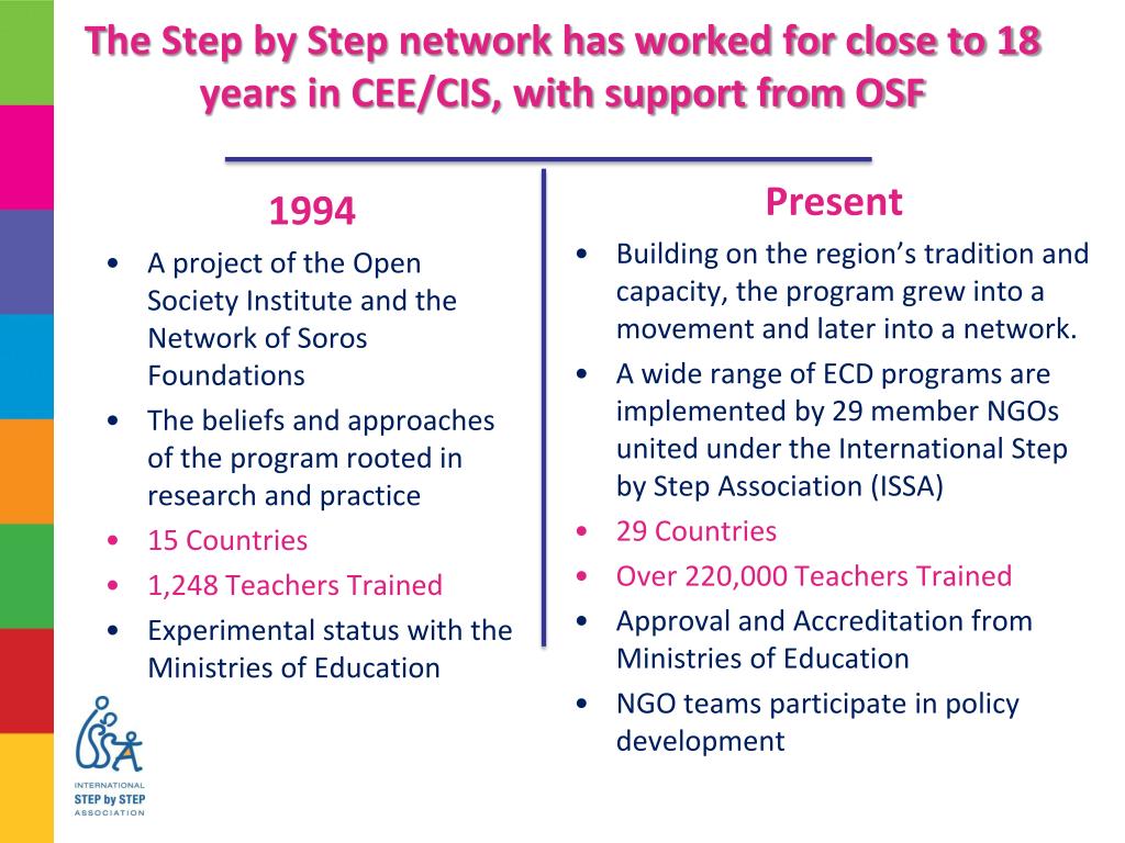 1994 A project of the Open Society Institute and the Network of Soros Foundations The beliefs and approaches of the program rooted in research and practice 15 Countries 1,248 Teachers Trained Experimental status with the Ministries of Education Present Building on the region’s tradition and capacity, the program grew into a movement and later into a network. A wide range of ECD programs are implemented by 29 member NGOs united under the International Step by Step Association (ISSA) 29 Countries Over 220,000 Teachers Trained Approval and Accreditation from Ministries of Education NGO teams participate in policy development The Step by Step network has worked for close to 18 years in CEE/CIS, with support from OSF