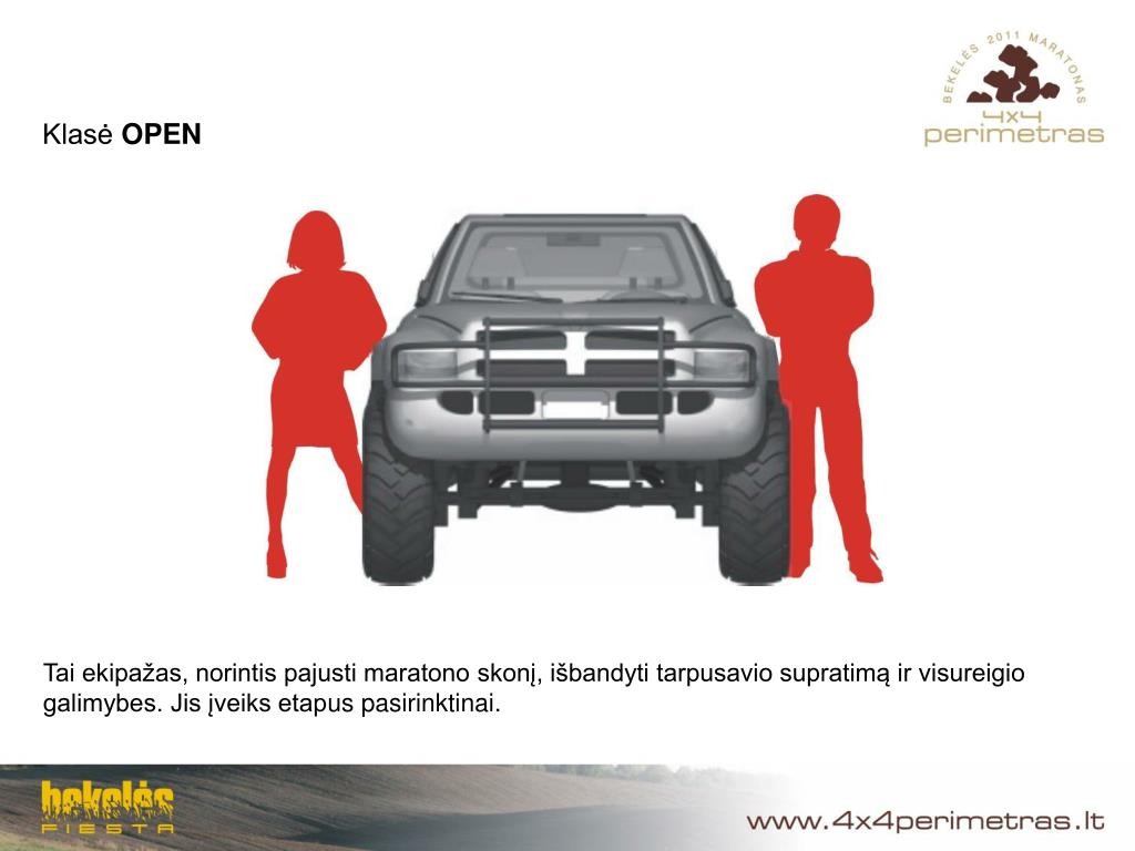 Klasė OPEN Tai ekipažas, norintis pajusti maratono skonį, išbandyti tarpusavio supratimą ir visureigio galimybes. Jis įveiks etapus pasirinktinai.